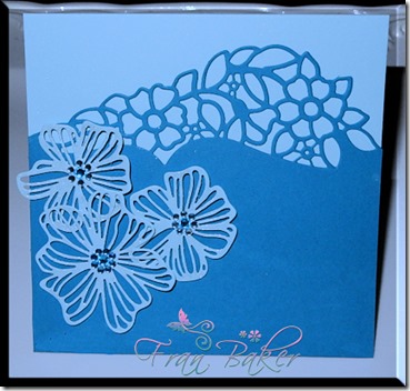 I belong to Spellbinder’s Small Die of the Month Club. And for the month of February I received 5 border dies. I cut four borders from one of the dies out of gold cardstock. And laid them evenly spaced on the card front.
